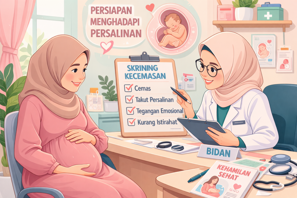 Kehamilan merupakan momen penting yang membawa perubahan fisik, psikologis, dan emosional bagi setiap ibu. Khususnya pada trimester ketiga, banyak ibu hamil mulai merasakan kecemasan dan ketakutan terkait proses persalinan yang akan mereka jalani. Kecemasan ini, bila tidak ditangani dengan tepat, dapat memengaruhi kondisi kesehatan ibu maupun janin, meningkatkan risiko komplikasi selama persalinan, serta memengaruhi kualitas pengalaman persalinan secara keseluruhan. Oleh karena itu, deteksi dini melalui skrining kecemasan menjadi langkah penting yang dapat dilakukan oleh bidan sebagai tenaga profesional yang mendampingi ibu hamil secara langsung.