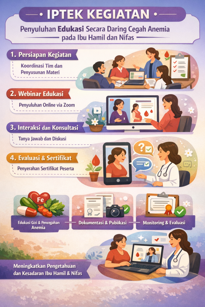Melalui platform Zoom, peserta mengikuti pretest untuk mengukur pemahaman awal mereka mengenai anemia. Hasil awal menunjukkan masih banyak kesenjangan pengetahuan, dengan rata-rata jawaban benar hanya 60 persen. Webinar kemudian dimulai dengan penjelasan mendalam mengenai pengertian anemia, faktor penyebab, dan dampaknya terhadap kesehatan ibu serta perkembangan janin. Narasumber dan tim mahasiswa menyampaikan informasi secara sistematis dan ilmiah, sekaligus memadukannya dengan contoh nyata dan strategi pencegahan yang dapat diterapkan sehari-hari, termasuk konsumsi makanan kaya zat besi, suplementasi sesuai anjuran, serta pentingnya kontrol kehamilan rutin.
